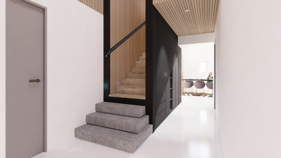 L'appartement n°2 s'ouvre sur un long hall d'entrée qui donne accès à une salle de bains ainsi qu'à un WC séparé. Le couloir vous guide ensuite vers un bel espace de vie combinant salon et salle à manger, baigné de lumière grâce à une vide sur séjour qui apporte volume et élégance.