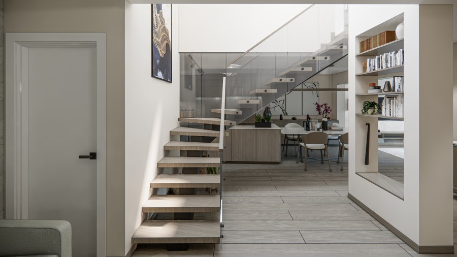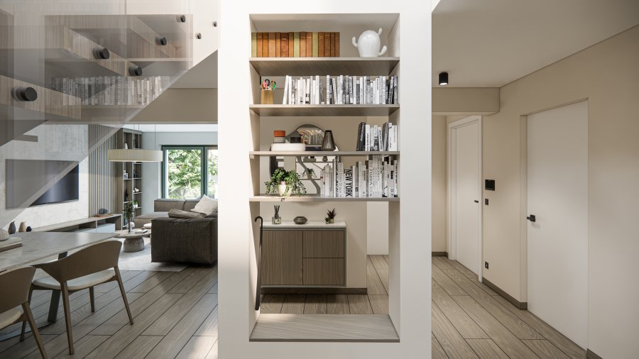 Un toilette séparé est également présent à ce niveau, ainsi qu'un bureau situé sur un côté du hall, parfait pour travailler tranquillement ou créer un espace multifonctionnel.