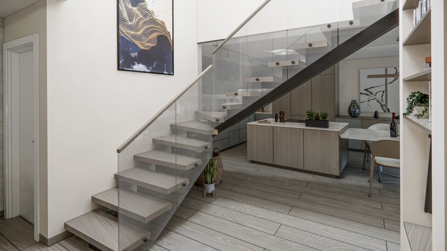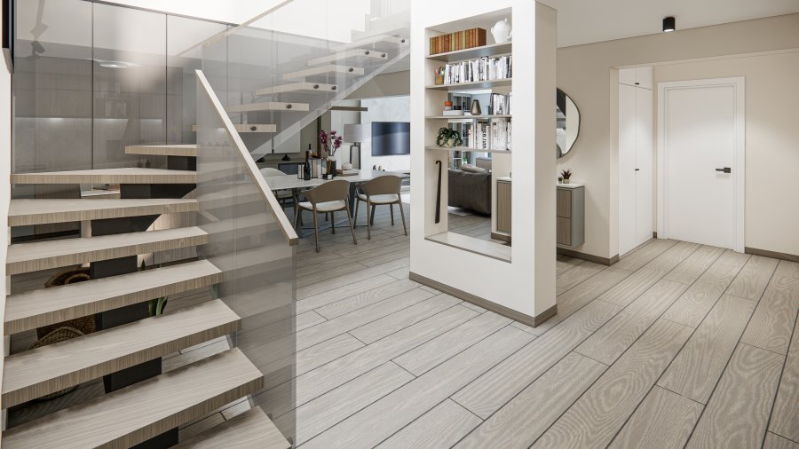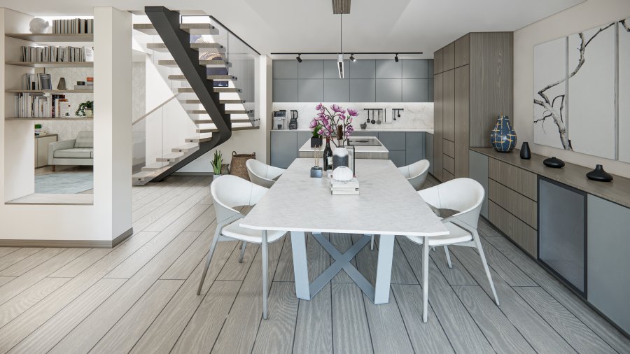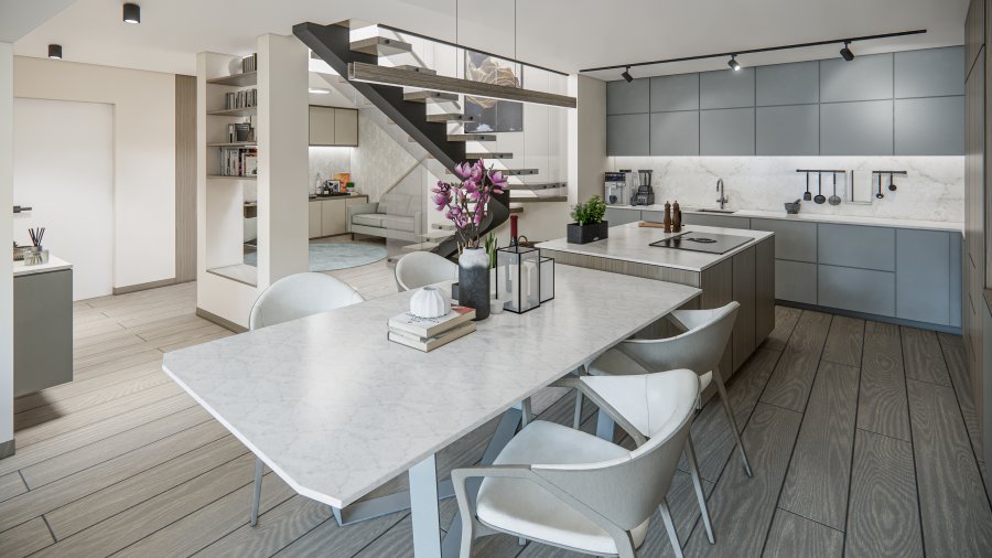 L'appartement n°6 se déploie sur deux niveaux avec un agencement harmonieux. Le premier étage s'ouvre sur un hall d'entrée qui mène à une vaste cuisine ouverte avec un coin repas, idéale pour des moments de convivialité. Un agréable salon prolonge cet espace de vie, offrant confort et luminosité.