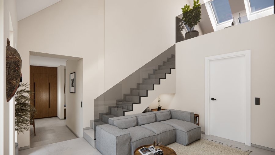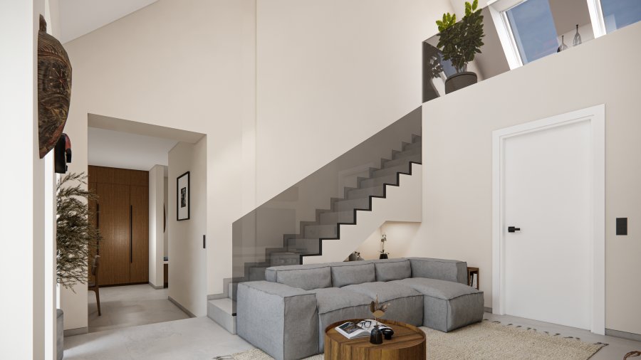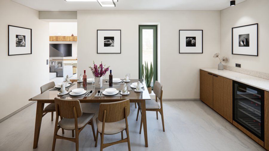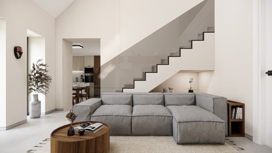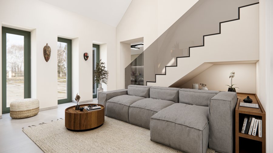 The living room extends into a bright lounge and dining area, bathed in light thanks to the void above the living room, creating a beautiful opening to the upper floor and showcasing the volumes.
