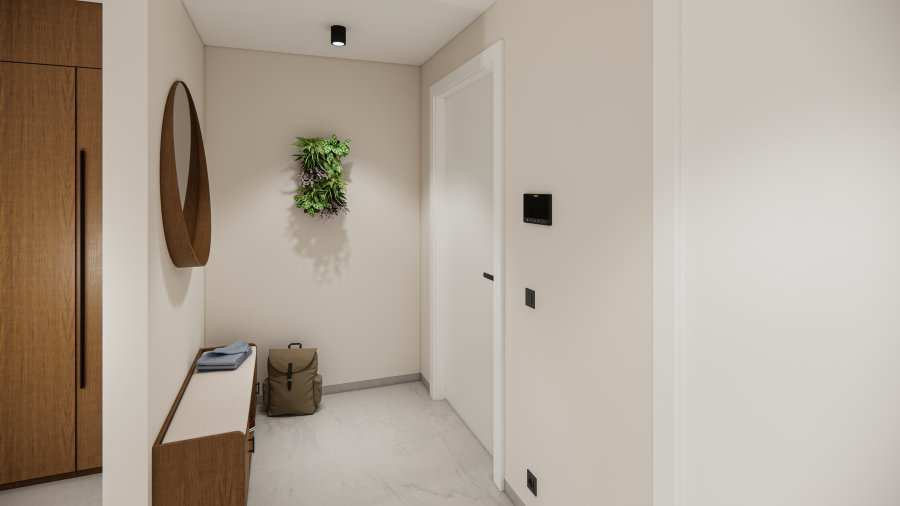 The entrance guides you to a spacious hall leading to a separate toilet and a bathroom. An office, ideal for remote work or a guest bedroom, is located next to a large kitchen offering ample storage and a nice circulation space.